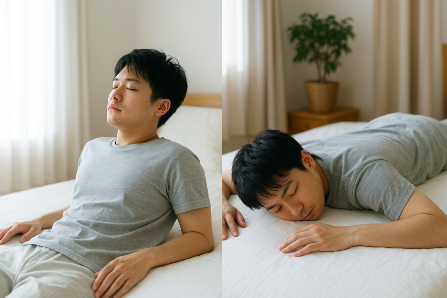 多くの人が最初に抱く疑問が「仰向けと、うつ伏せではどちらが体に良いのか」という点です。専門家の意見では、仰向けは背骨の自然なカーブを保ちやすく、体全体の圧を分散できるとされています。一方、うつ伏せは安心感が得られる場合があり、いびきの軽減につながることもあると言われています。ただし「必ずどちらが良い」と決めつけるのではなく、自分の体調や快適さを基準に選ぶことが大切だと考えられています(引用元:https://www.nihonbashi-nishikawa.com/column/pillow/sleep-on-your-stomach/?utm_source=chatgpt.com)。