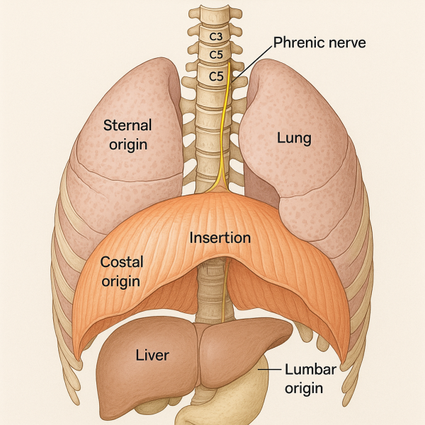 横隔膜は横隔神経によって支配されています。横隔神経は頸椎のC3〜C5から出て走行し、横隔膜に到達します。この神経が呼吸運動をコントロールしており、「C3,4,5 keeps the diaphragm alive」という表現で知られていると言われています。もしこの神経が損傷すると横隔膜の動きに影響が出る可能性があると考えられています。